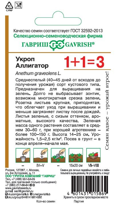 Среднеспелый (40-45 дней от всходов до получения урожая) сорт кустового типа. Предназначен для выращивания на зелень. Долго не образует зонтик, возможна многократная срезка зелени. Розетка листьев крупная, приподнятая, что облегчает уход при выращивании и меньше загрязняет листву после дождей. Листья зеленые с сизым оттенком, ароматные, высокого качества. Зеленая масса одного растения составляет в среднем 30-60 г, при хорошей агротехнике-более 100-150 г. Высота розетки 14-25 см. Посев в грунт — конец апреля-начало мая. Урожайность 1,5-2,5 кг/м2.