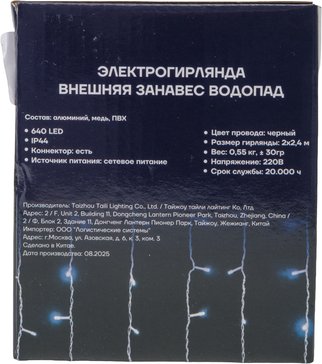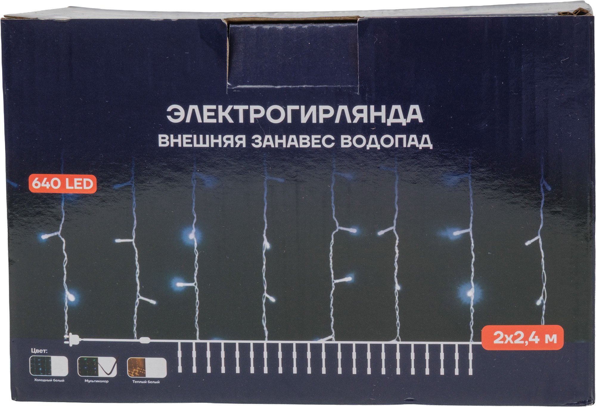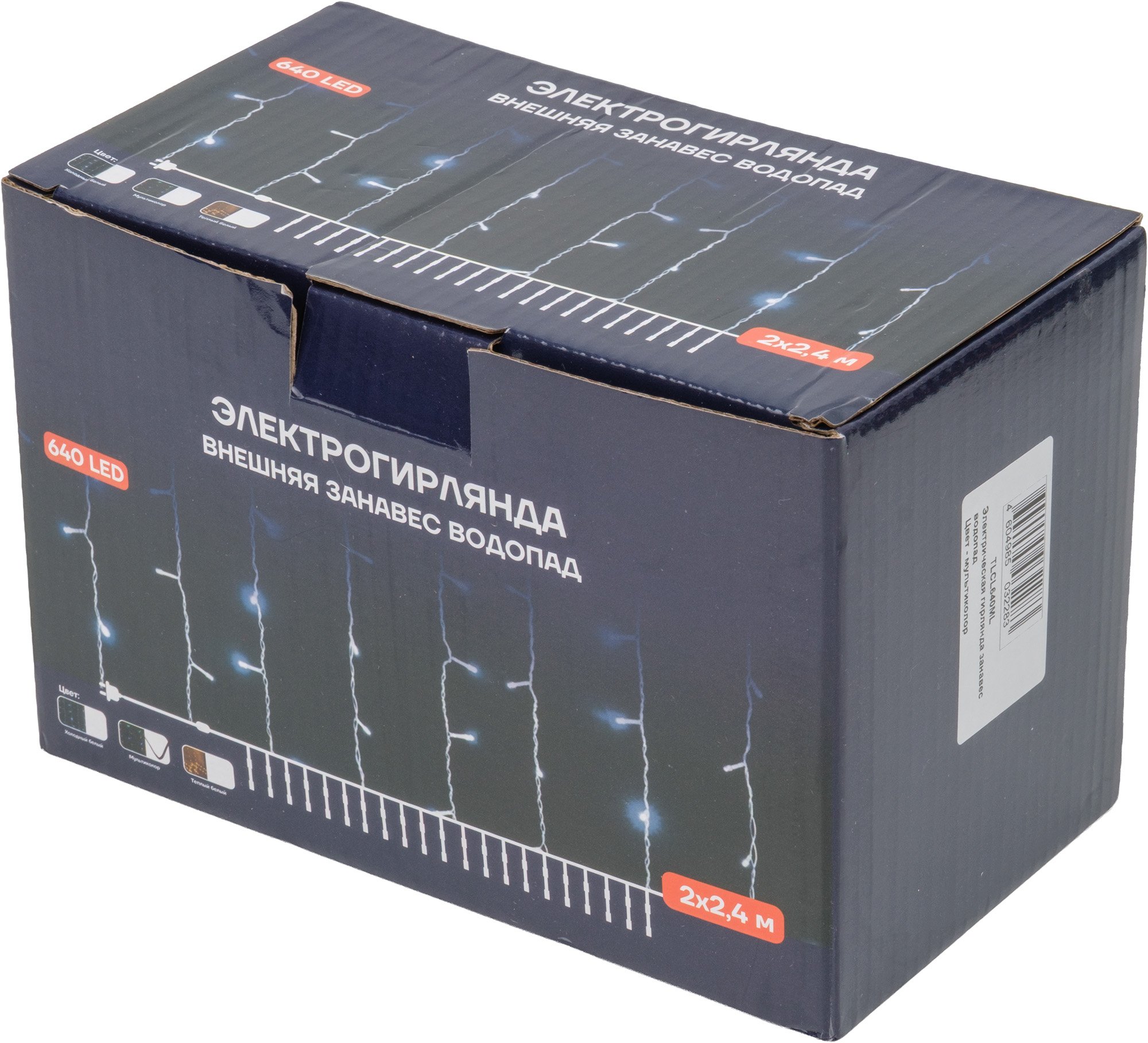 - Электрогирлянда внешняя Занавес Водопад 2х2,4м 640LED IP44, мультиколор, с коннектором, прозрачный кабель