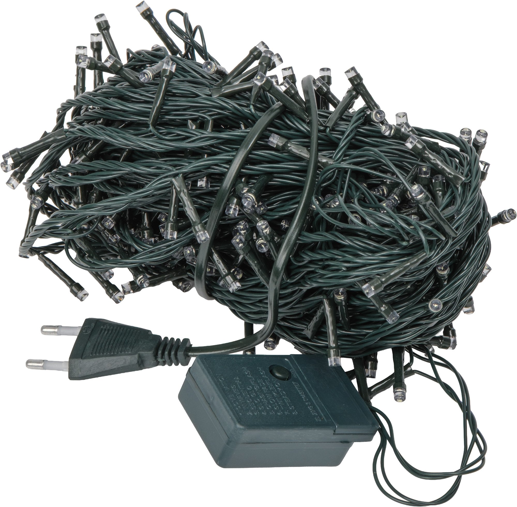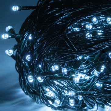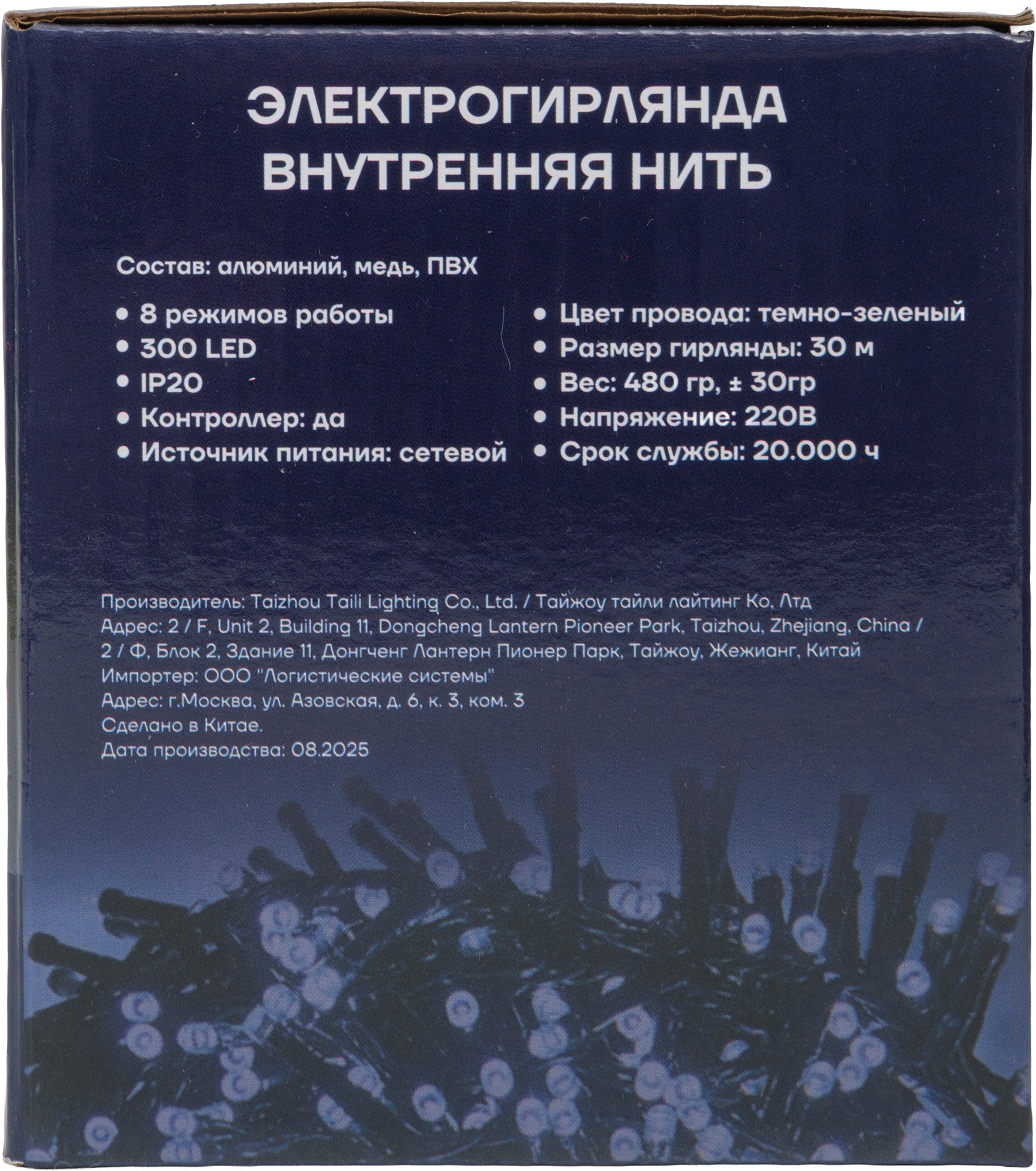 - Электрогирлянда внутренняя Нить 30м 300LED, холодный белый, контролер 8 режимов, темно-зеленый кабель