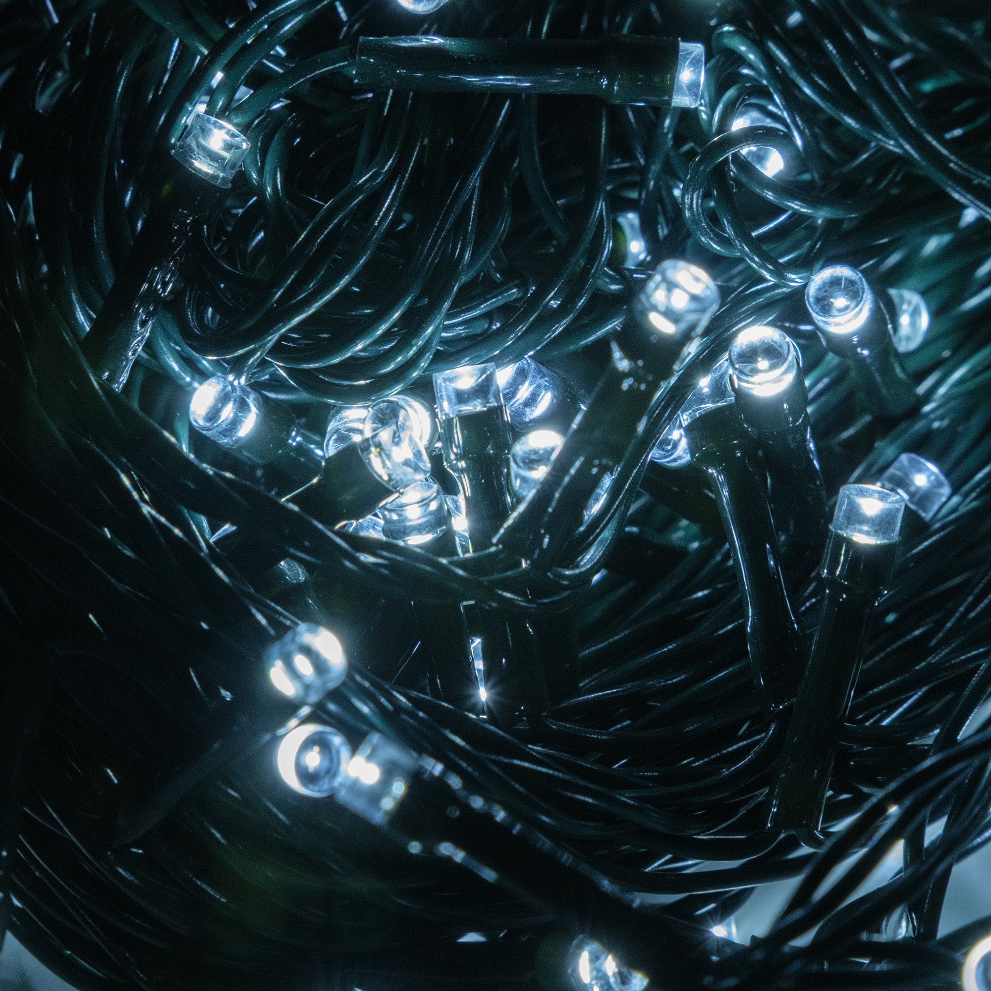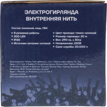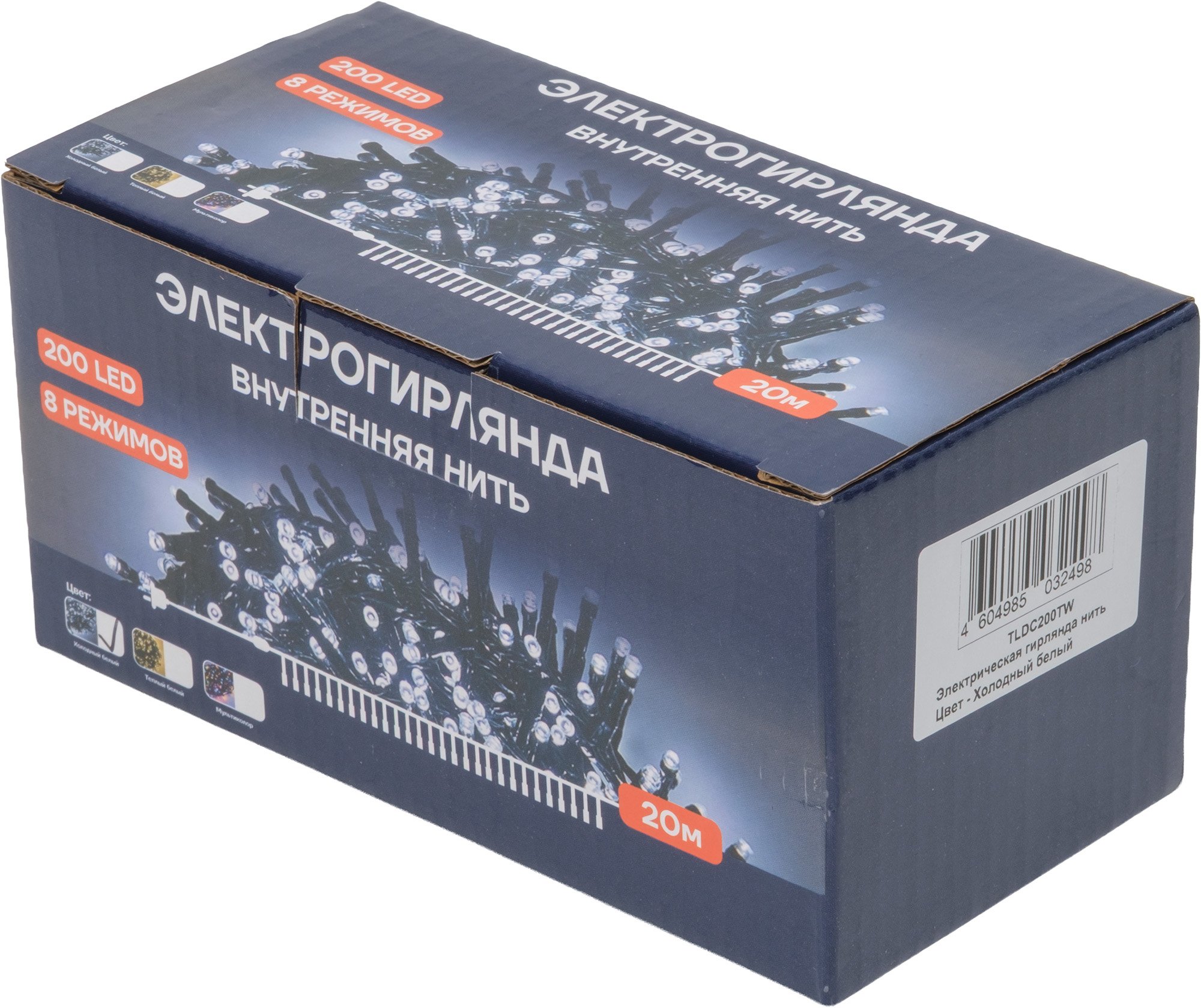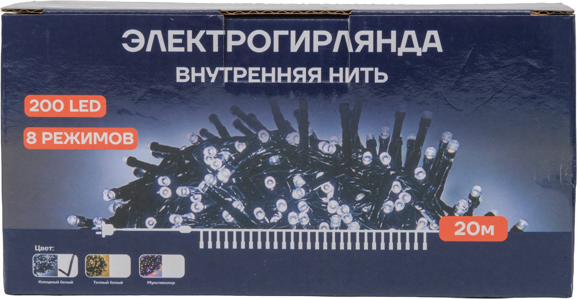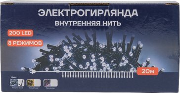 - Электрогирлянда внутренняя Нить 20м 200LED, холодный белый, 8 режимов, темно-зеленый кабель