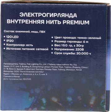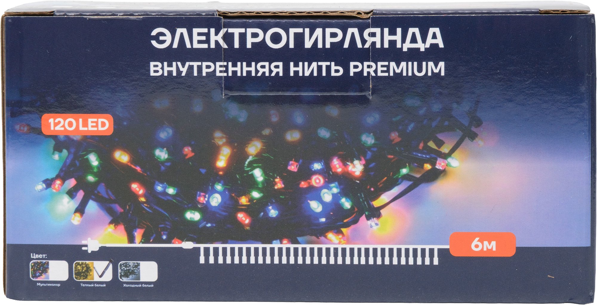 - Электрогирлянда внутренняя Нить Premium 6м 120 LED, теплый белый, fast flash, контролер, темно-зеленый кабель