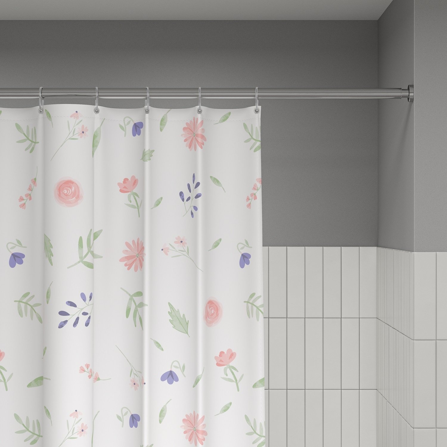 Текстильная штора для ванной белого цвета с красивым растительным узором в стиле прованс из цветов и зеленых листьев.