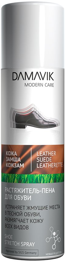 Специальный растяжитель-пена «DAMAVIK» для быстрого устранения жмущих мест в тесной обуви и размягчения кожи. Эффективно воздействует на волокна кожи, растягивая их и фиксируя в нужном положении, не изменяя при этом структуры. Подходит для обуви всех видов кожи (гладкой, замши, велюра, нубука), кожзама.