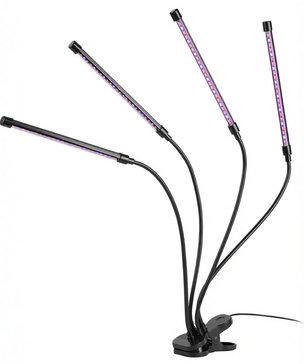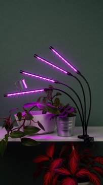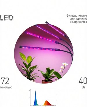 Купила эту фитолампу красно-синего спектра на прищепке для своих орхидей. Мощность 40Вт — свет очень интенсивный. Прищепка крепится надежно к полке, угол наклона регулируется. Орхидеи, которые давно не цвели, через месяц выпустили цветоносы! Свет специфического розово-фиолетового оттенка, в жилой комнате некомфортен, но для растений — то что надо. Использую по 10-12 часов в день. Результат налицо!
