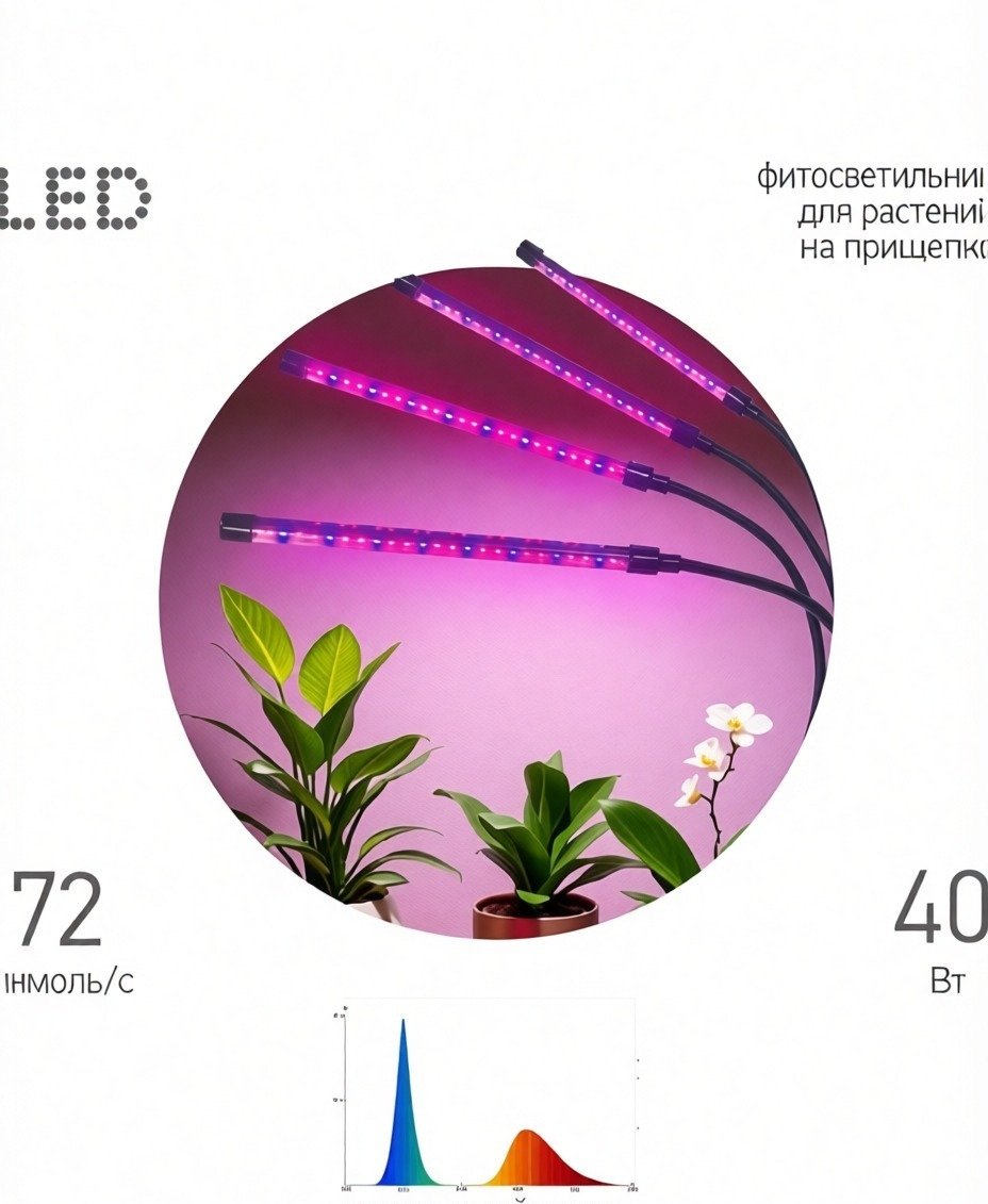 Мощности 40 Вт достаточно для эффективной досветки одного крупного растения или группы из 3-4 небольших горшков на площади около 0,4-0,5 м². Рекомендуемая высота подвеса — 30-50 см от верхних листьев, которую можно легко регулировать благодаря прищепке.