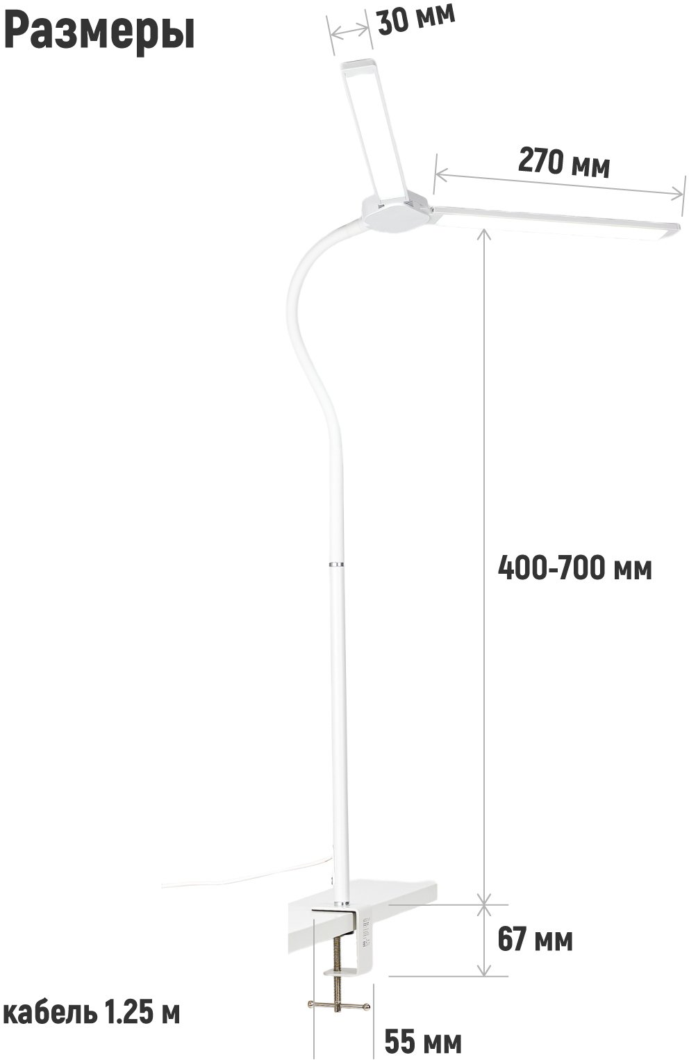 Благодаря креплению на струбцине легко фиксируется на краю стола или полки, не занимает много места. Светодиодная технология обеспечивает энергоэффективное и равномерное освещение, отличается долговечностью.