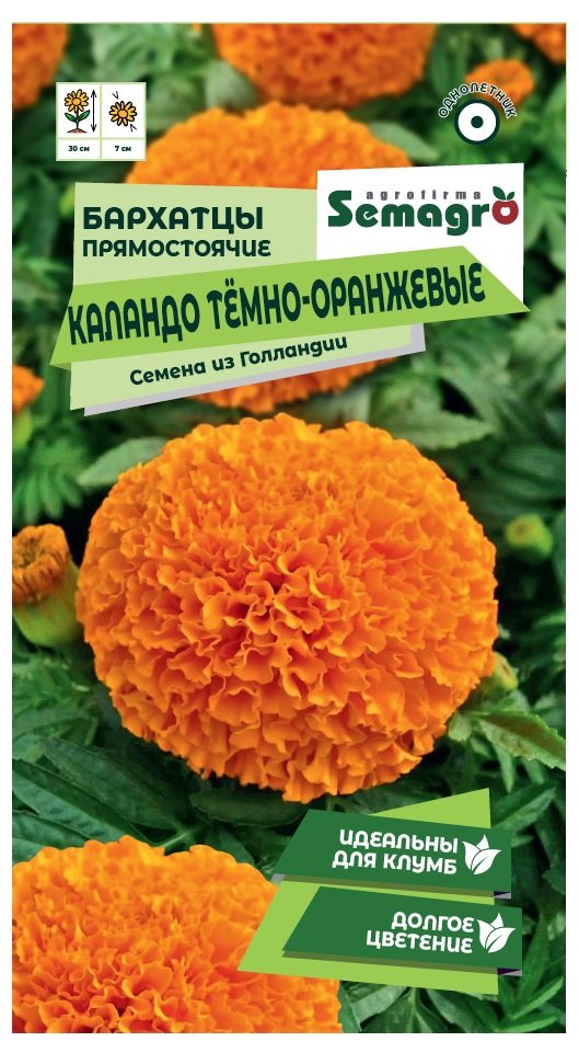 Одно из самых распространенных неприхотливых однолетних цветочных растений. Соцветия- крупные корзинки 6-10 см в диаметре, махровые, тёмно-оранжевого цвета на прочных цветоносах. В грунт рассаду высаживают после окончания весенних заморозков, выдерживая расстояние между растениями 20-30 см. Для продления цветения следует удалять увядшие цветки. Засухоустойчив, заморозков не переносит. Идеально для букетов и клумб. Выбор профессионалов.