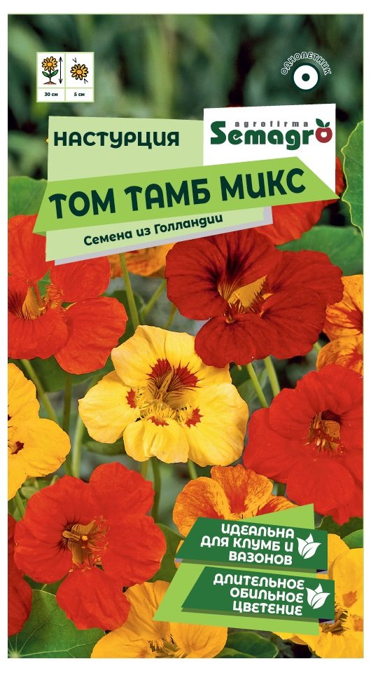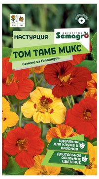 Хотите добавить в цветник сочные краски и необычную фактуру? Настурция «Том Тамб микс» покорит вас пышными махровыми цветками и эффектными округлыми листьями, создавая в саду атмосферу южного праздника.