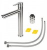 Однозахватный высокий смеситель для накладной раковины Agger Easy с фиксированным изливом гармонично дополнит интерьер ванной комнаты в современном или традиционном стиле. Фирменный керамический картридж Agger и эргономичный рычаг делают легким управление напором и температурой воды. Корпус изделия изготовлен из высококачественной нержавеющей стали, не подверженной коррозии от длительного контакта с водой. Износостойкое покрытие в цвете матовый сатин, за которым очень просто ухаживать мягкой салфеткой, нанесено методом вакуумного напыления. Встроенный аэратор экономит воду и, обогащая струю воздухом, делает ее мягкой без брызг. Гибкая подводка 50 см.