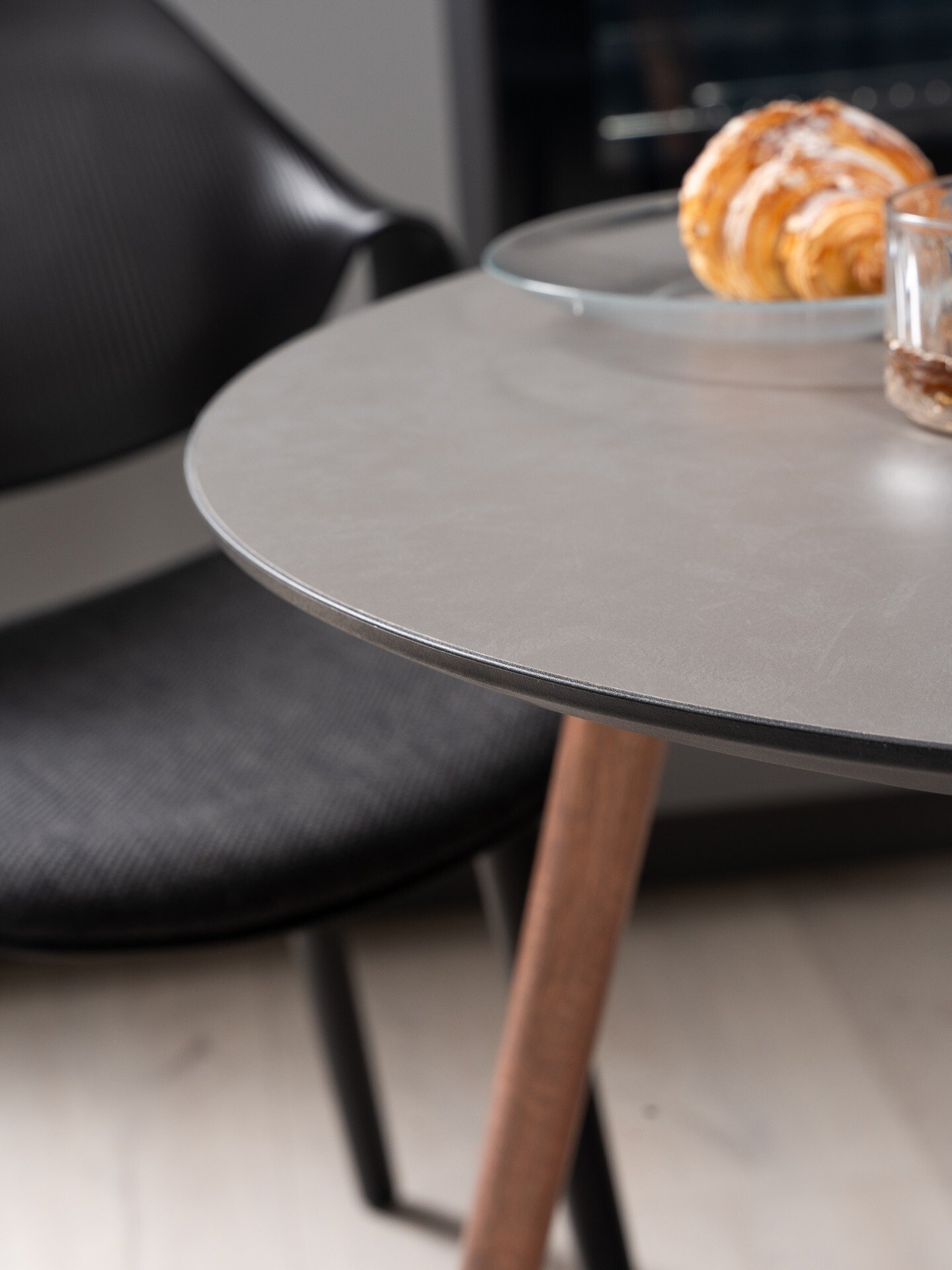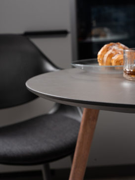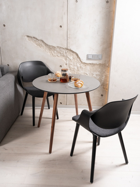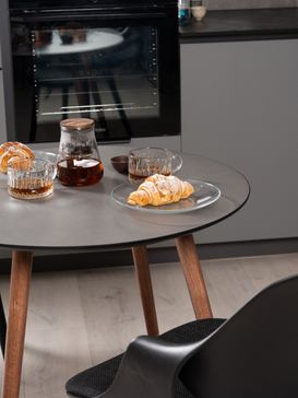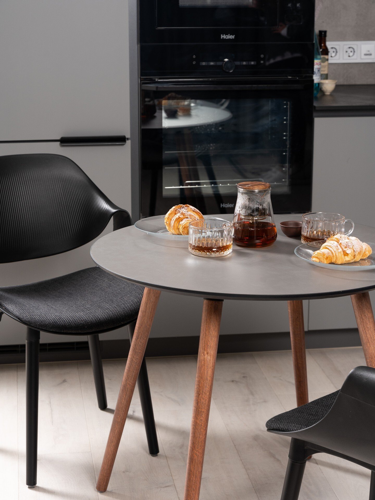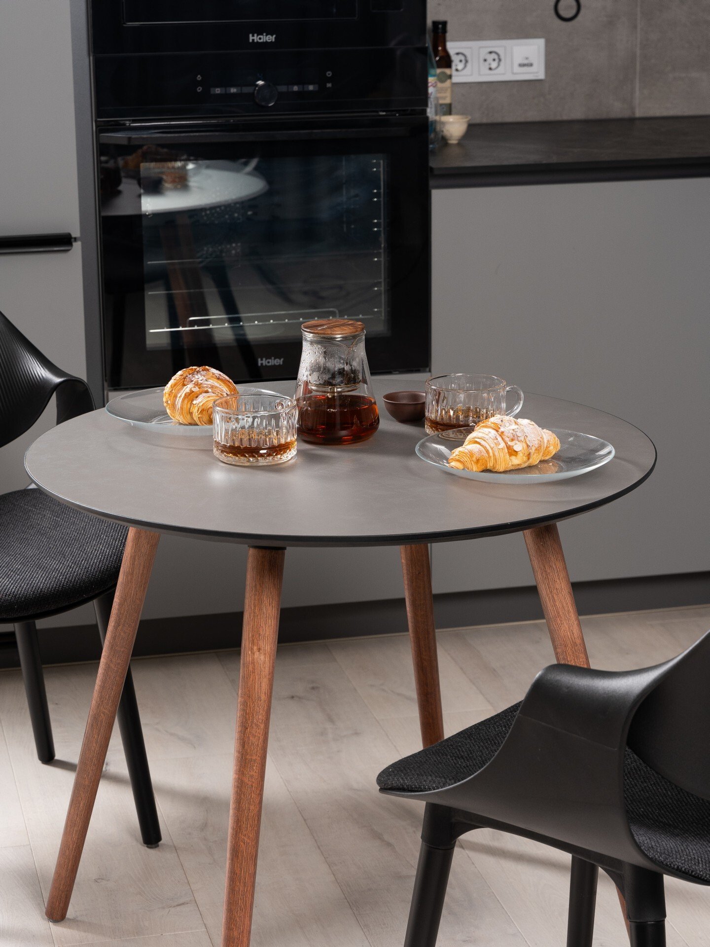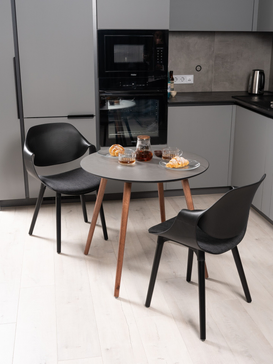 Графитово-серый оттенок вписывается в любую цветовую гамму кухни. Не нужно подбирать стулья в тон — подойдут как белые, так и яркие модели. Стол выступает как спокойный арт-объект, объединяющий разные элементы интерьера.